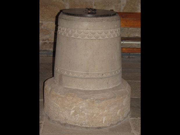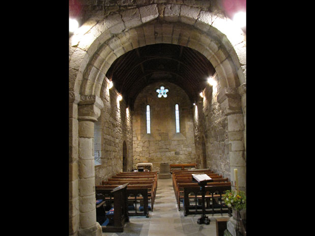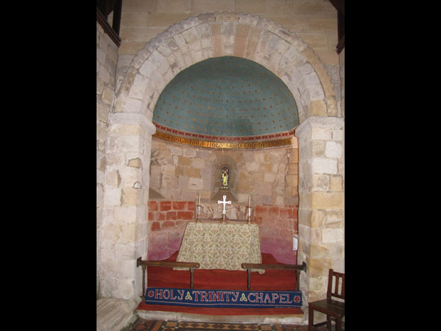 Although of Norman connections as illustrated by the large blocks in the lower levels of the North and West arches, there are some Anglo-Saxon notes to the structure – the first (chancel) arch has capitals decorated with leaves, heads and an abacus with a frieze of saltire crosses likewise the second (apse) arch. In the chancel an effigy of a lady in C14th costume rests between two kneeling angels. This is thought to be the work of sculptors who had a workshop near Alnwick until about 1340. The apse (sanctuary) is lit by two partly modern Norman windows. On the South wall is a recess which served as a fenestelia of a piscine whose bowl is broken away. On the North side is an Aumbrey. However, both of these recesses are so low they would indicate that the floor level has been raised.